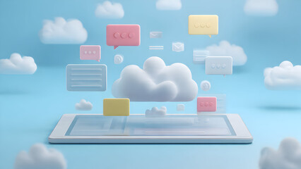 A soft gradient illustration of cloud-sync notifications hovering around a tablet