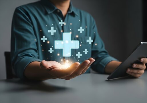 Person holding a tablet with a glowing plus sign hovering above their outstretched hand indoors