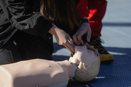 Details with the hands of a female student learning how to perform cardiopulmonary resuscitation (CPR) on a mannequin for educational purposes.