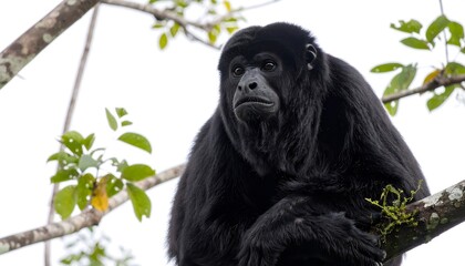 Black howler monkey, aluatta pigra, sitting on a tree in Belize jungle and howling like crazy. They are also found in Mexico and Guatemala. They are eating mostly leaves and occasional fruits.