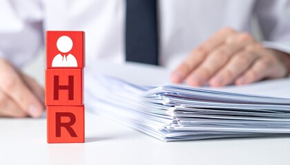 Close-up of HR cubes with documents on a table, human resources concept. A person is in the background.