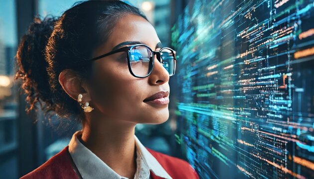 Data hologram and woman with code analytics, Programmer coding or IT person in glasses reading programming and cyber security research. Generative AI.