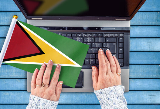 woman hands and flag of Vanuatu on computer, laptop keyboard