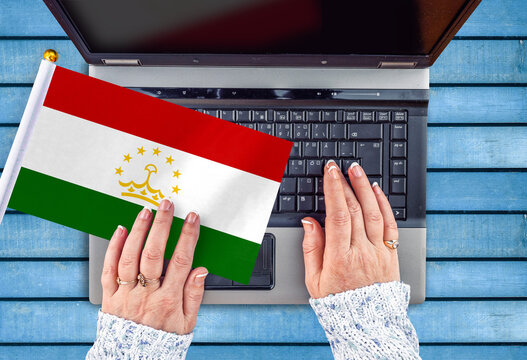 woman hands and flag of Mauritania on computer, laptop keyboard