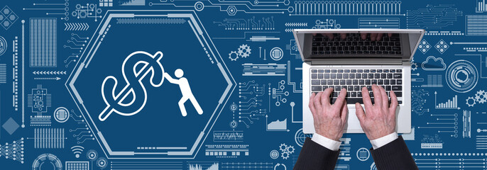 Working woman typing on laptop with digital hud icons for online learning and coworking