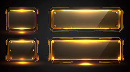 Gold glass button interface, light frame banner set, glass panel set for mobile and web app, tech board frame in futuristic style. Light banner collection with glow effect, vector illustration.