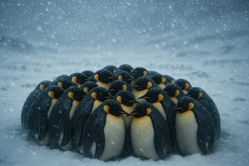 Penguins huddling in snowstorm.