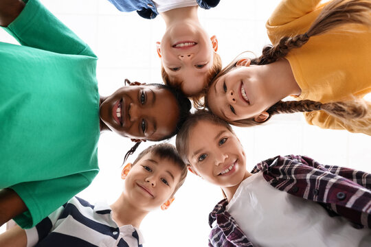 Happy children huddling at school, bottom view