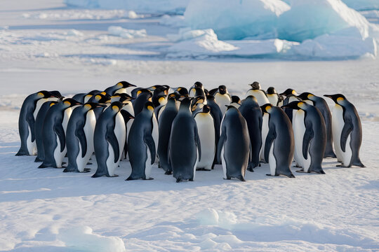 Group of emperor penguins huddling on the Antarctic ice