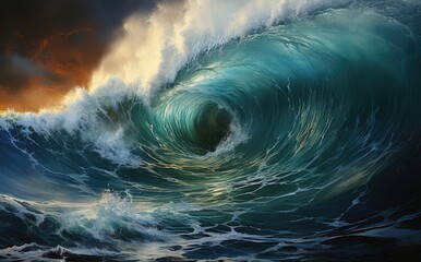 A massive tsunami wave approaches the coastline, threatening to engulf everything in its path. Nature's fury unleashed.