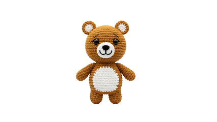 Adorable brown crocheted teddy bear with white accents and a friendly smile stands on a white background showcasing its cute design and charming expression.