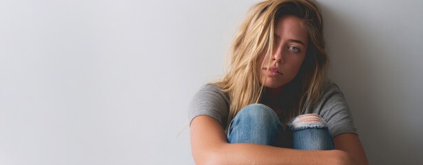 The young woman sitting against a white wall hugging her knees and looking pensive