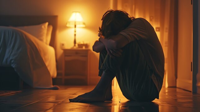 A white teenager sitting on the floor of a dimly lit room, hugging their knees and crying.