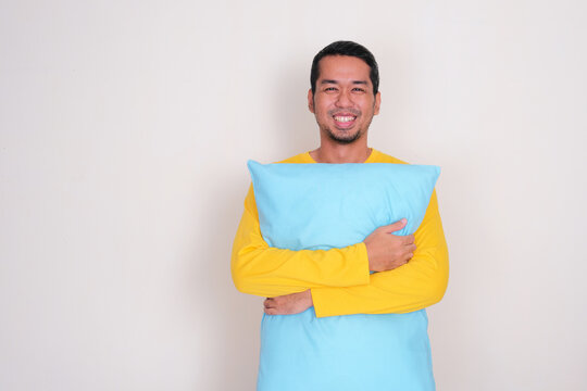 Adult asian man smiling happy while hugging a pillow