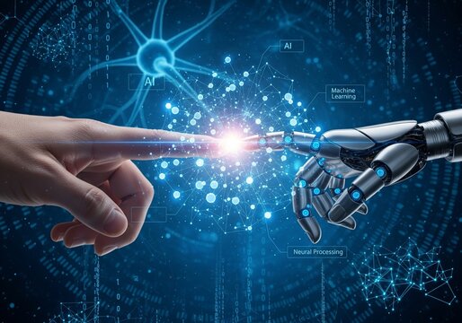 A human hand touching a robotic finger, bokeh lights on a blue background, illustrating human-robot interaction. Generative AI