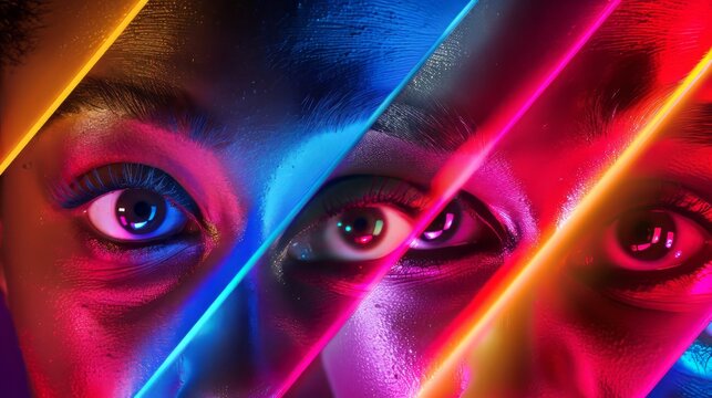 Vibrant neon stripes: close-up of multicolored human eyes in neon light collage - male and female models