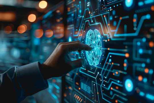 Human Hand Interacting With Virtual Neural Interface On Screen Images