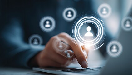 Close-up of hands interacting with a digital interface displaying person icons