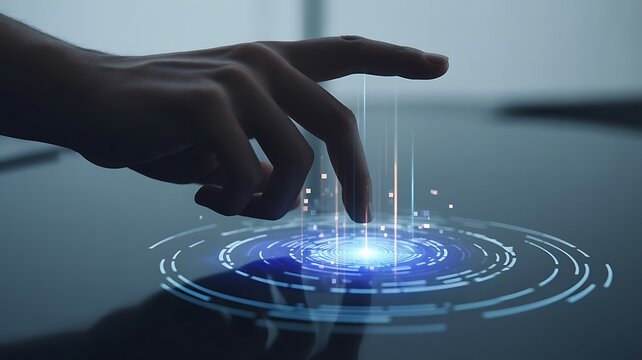 A close-up of a hand interacting with a floating holographic interface