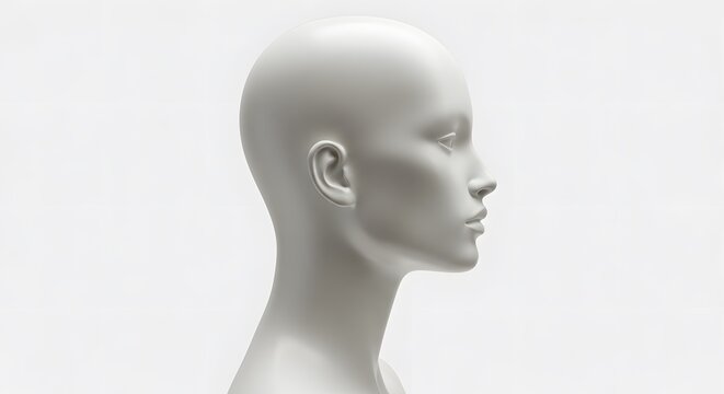 AI image displaying a clean, neutral white mannequin head shown in perfect profile view against a plain white background surface.