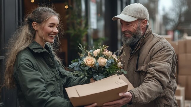 A cheerful man hands a bouquet of flowers and a parcel to a smiling young woman in front of a store, capturing a moment of heartwarming gesture and human connection.