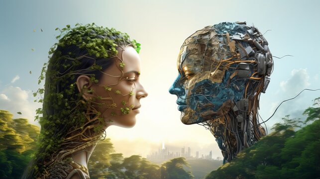 An AI robot hand and a human hand exchanging a tree sapling, symbolizing sustainability, innovation, and harmony between nature and technology for a green future and environment