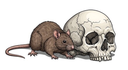 An illustrated brown rat poses next to a weathered human skull.