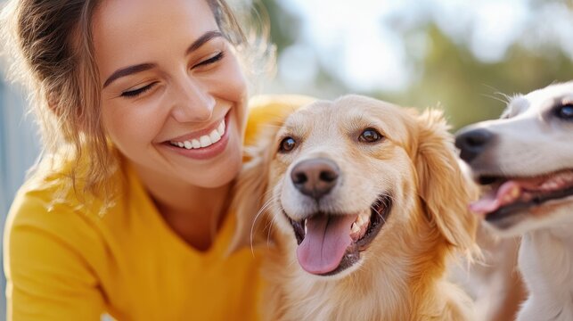 A cheerful woman embraces her two dogs in an outdoor setting, depicting happiness and the close bond between pets and humans on a bright, sunny day.