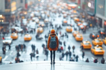 A person with a backpack stands at the edge of a busy city street, looking out over the urban landscape