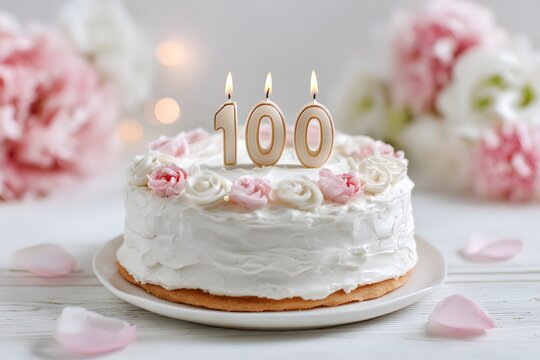 Birthday cake with number 100 candle on wooden table. Celebration of hundredth anniversary or special milestone event concept.