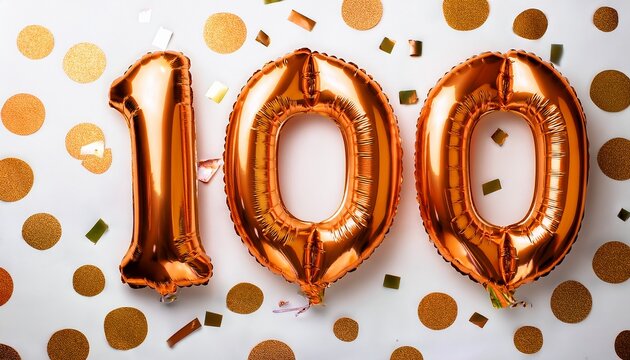 Orange balloon number 100 for hundredth birthday or anniversary party. White background with confetti