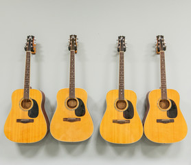 Four acoustic guitars hanging on a white wall