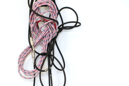 Untidy musical instrument cables. Tangled guitar leads hanging on wall.