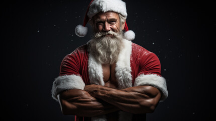 Happy attractive athletic man with naked torso and muscles posing in santa claus clothing elements near Christmas tree on white background . High quality photo