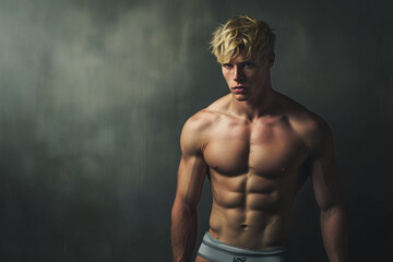 Fitness concept. Muscular and sexy torso of young man having perfect abs, bicep and chest. Male hunk with athletic body.