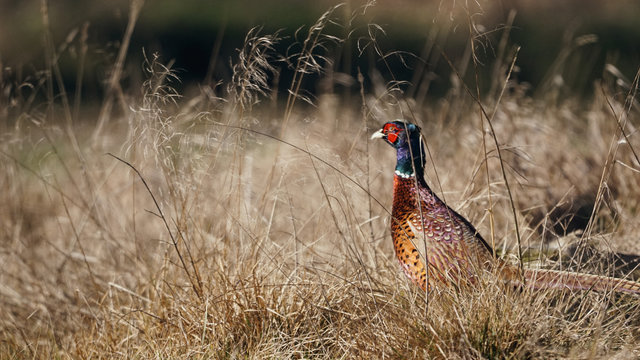 Close-up wildcat peering through dry reeds hunting in camouflaged grassland with amber eyes