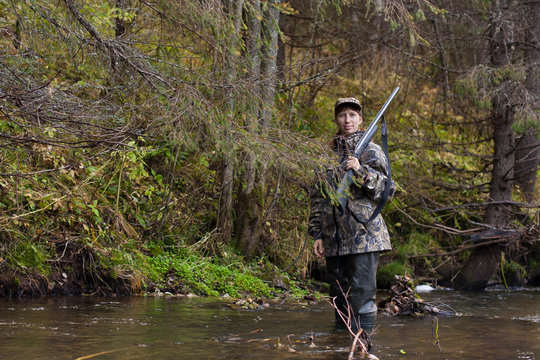 Female hunter in camouflage clothes ready to hunt, holding gun and walking in forest.