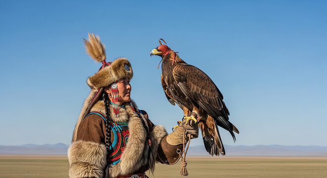 A portrait of a Mongolian eagle huntress with her golden eagle. A Kazakh woman in traditional fur clothing holding a bird of prey. Nomadic falconry tradition in Central Asia