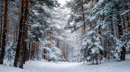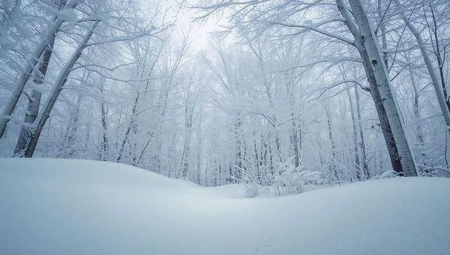 Blanketing birch forest with smooth snow drifts and frosted branches