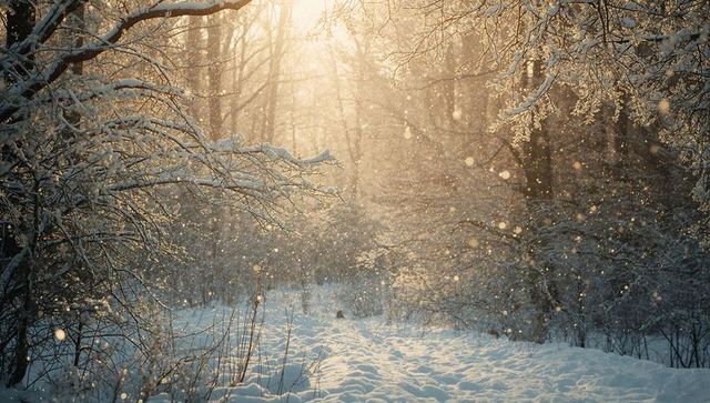 Sunbeams streaming through frosted trees over snowy trail, golden winter forest glow