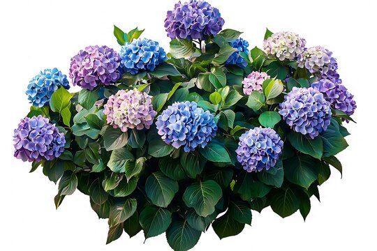 Colorful flower bush with hydrangea blooms on a transparent background.