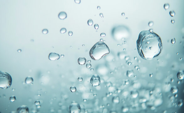 Transparent blue clear water surface texture with ripples, splashes and bubbles. Abstract summer banner background Water waves in sunlight with copy space Cosmetic moisturizer micellar toner emulsion