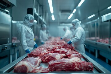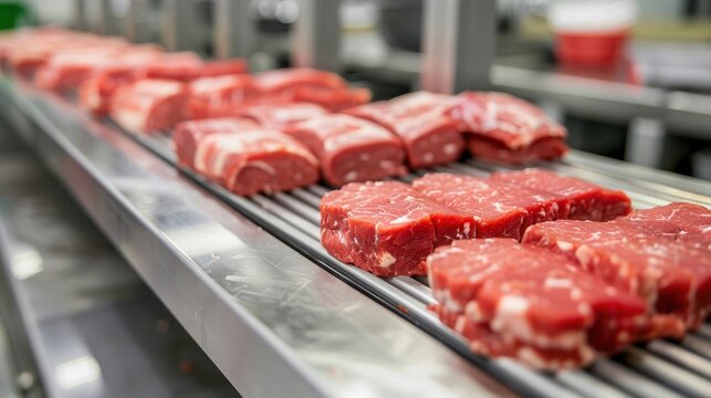Fresh pieces of raw beef on a conveyor belt in a modern meat processing facility, showcasing industrial food production and quality control.