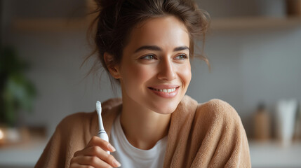 Faceless smiling woman holding electric toothbrush in bathroom, dental care dentist day, oral hygiene routine, teeth cleaning practice, defocused person, with copy