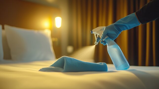 A person in blue gloves disinfects a hotel room bed with spray and cloth during the cleaning process