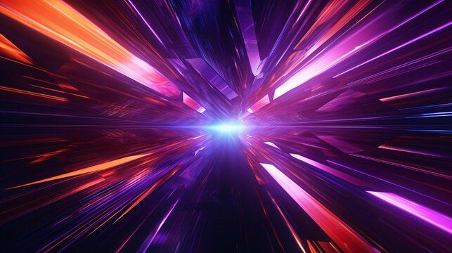 Abstract Neon Light Beams Convergence Point on Dark Background Featuring Lines of Light in Blue Pink Orange Colors, Creating Hyper Speed Effect with Futuristic Technology