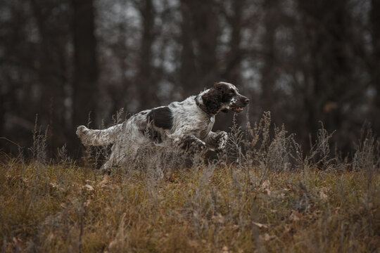 Happy fox terrier running wildly in the snow. Fun with a dog in the mountains. Hiking with a dog.