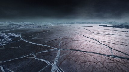 Stunning icy landscape on europa with a vast frozen ocean, deep cracks, and glowing subsurface light