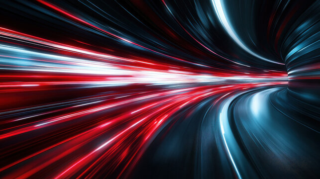 futuristic hyperspace tunnel surging with crimson blue light trails curving dynamically into neon abyss perfect for sci-fi wallpaper or tech banner backdrop