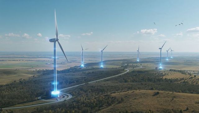 Glowing wind turbine farm powering rural grid with winding service road across plains